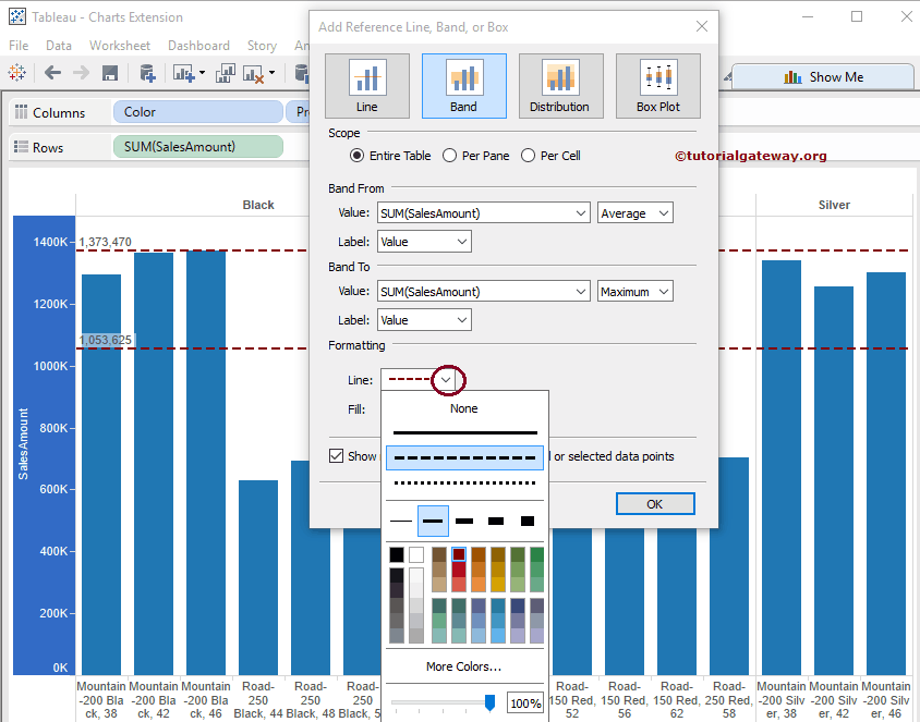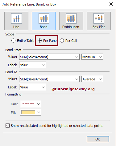 要为整个表添加 Tableau 参考带,请在 Scope 区域选择“整个表”选项。从下面的屏幕截图,您可以观察到“整个表参考带”选项中可用的选项。