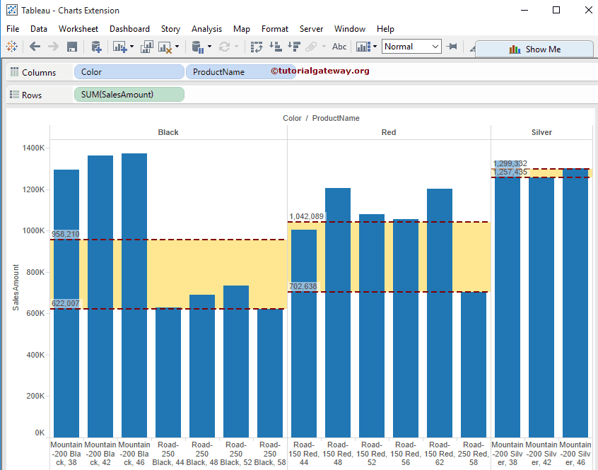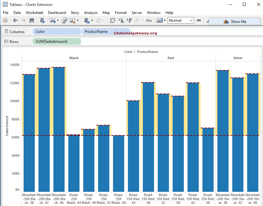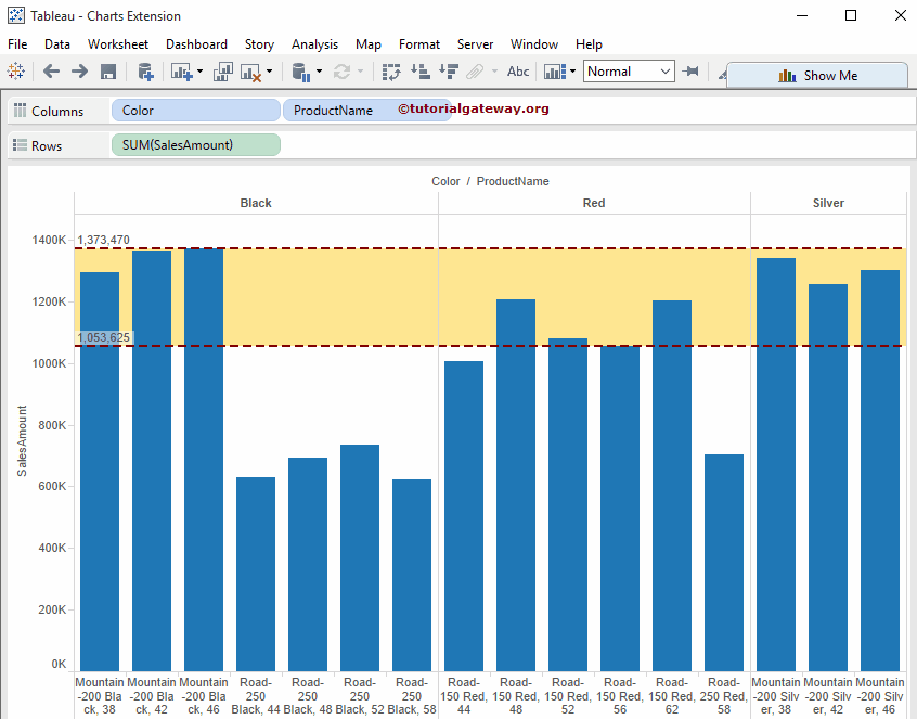 在此示例中,我们将为条形图添加参考带。为此,首先,将 Dimension Region 中的 Color、English Product Name 拖放到 Columns 区域,并将 Measures Region 中的 Sales Amount 拖放到 Rows 区域,如下所示。默认情况下,Tableau 会生成条形图。