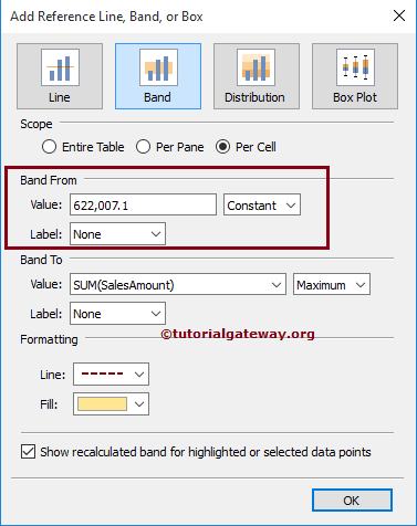 - 平均值:此选项将在所选度量(此处为 Sales Amount)的平均值处开始或结束参考带。