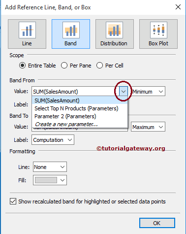 在“带起始值”和“带结束值”区域中,“值”选项将决定参考带使用的数据。请选择我们将用于创建参考带的度量值(此处,我们选择 Sales Amount)。Tableau 还允许您使用现有参数或新参数作为值。