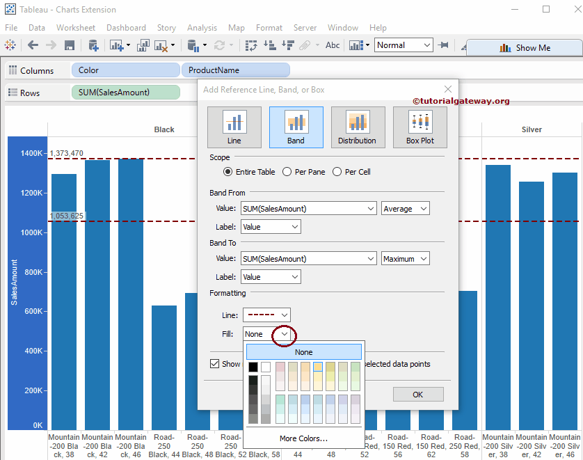 - 总计:此选项将在所选度量(此处为 Sales Amount)的所有值的聚合处开始或结束 Tableau 参考带。