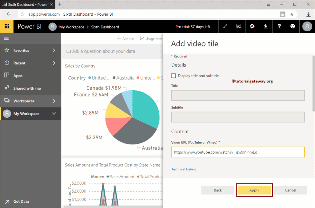 在本示例中,我们想将 YouTube 视频插入或添加到仪表板。因此,我们添加了 iPhone X。单击“应用”按钮。有关更多信息,请参阅 Power BI 中的 仪表板 文章。