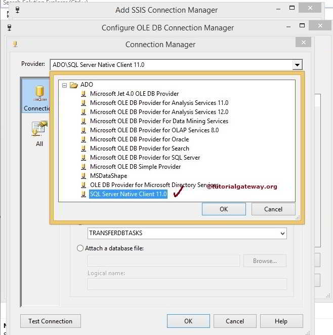 从上面的 SSIS ADO 连接管理器截图中,您可以观察到我们正在使用我们的 Windows 帐户作为服务器名称。并将 [TRANSFERDBTASKS] 作为数据库名称。