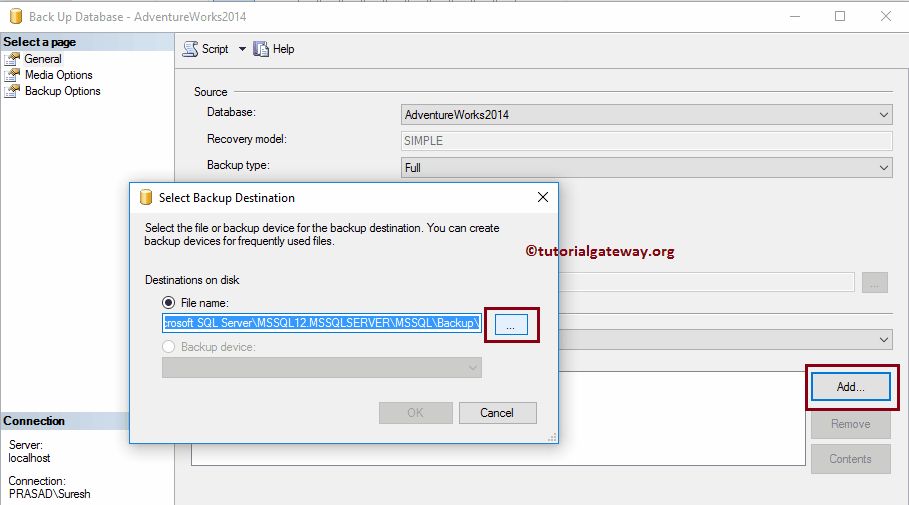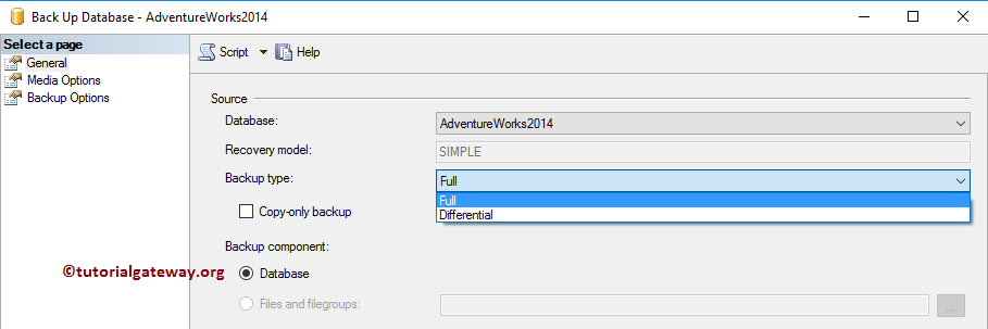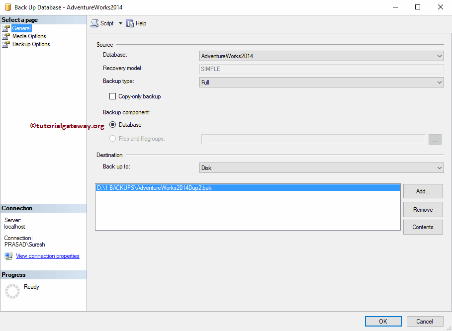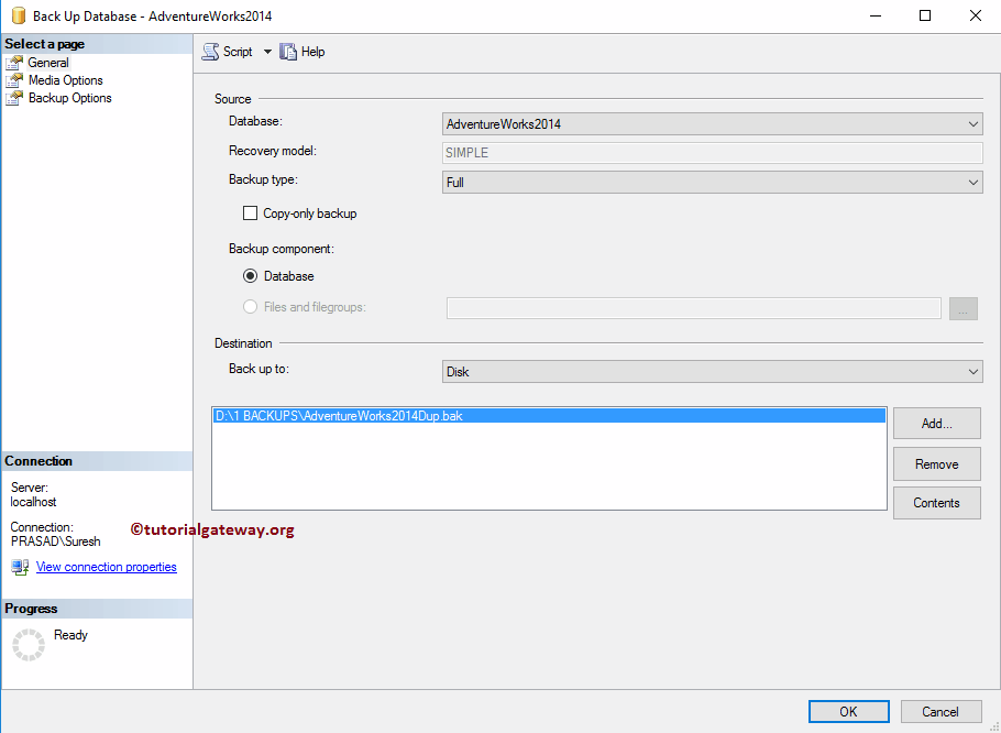 Back up to:此属性有两个选项:Disk(磁盘)和 URL。这意味着您可以将 .bak 文件保存在 URL(公司网站)或 DISK 中。目前,我们保留默认的 Disk。