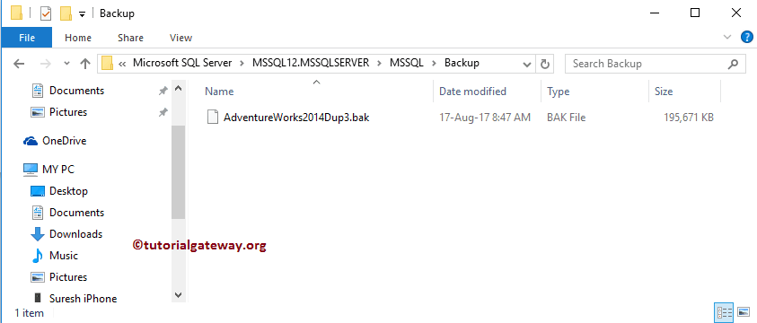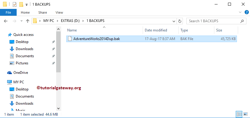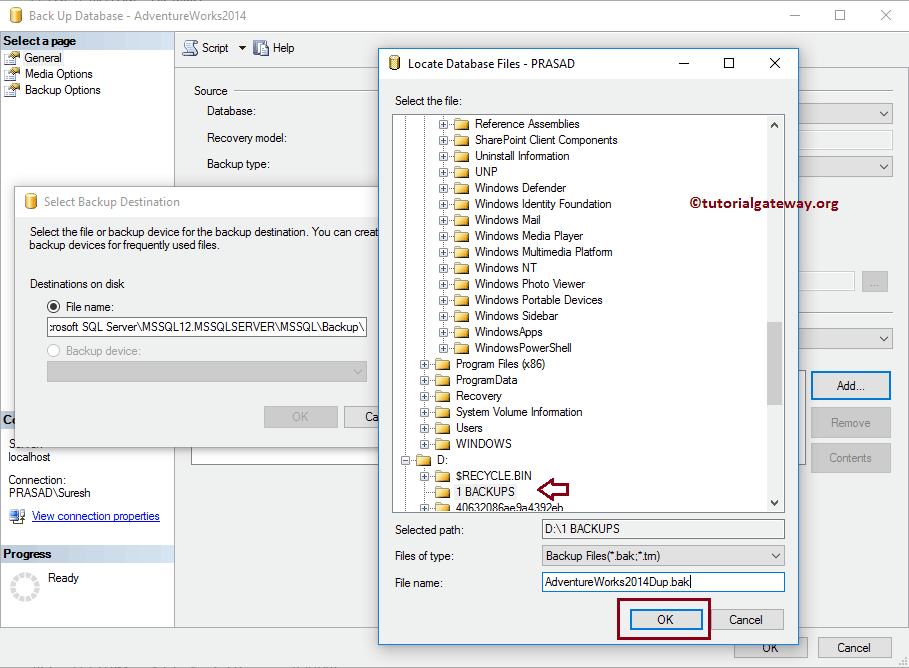 我们将选择 D 驱动器 -> 1 BACKUPSFolder -> AdventureWorks2014Dup 作为文件名。