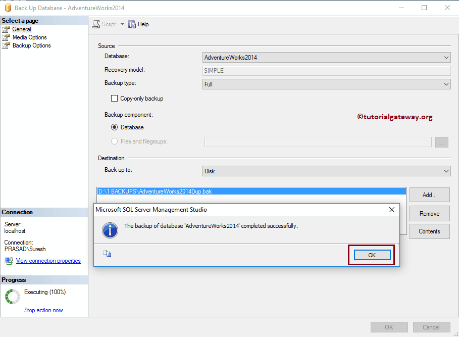 TO DISK = 'D:\1 BACKUPS\AdventureWorks2014Dup4.bak'