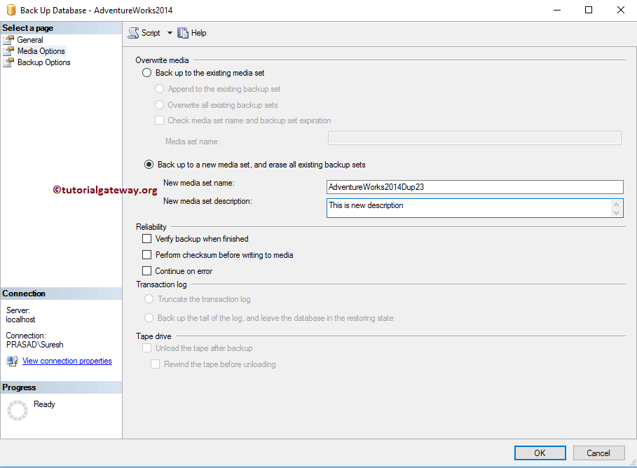 Media Options(介质选项):要创建加密的数据库备份,您必须选择 Back up to a new media set and erase all existing sets(备份到新的介质集并擦除所有现有介质)选项。