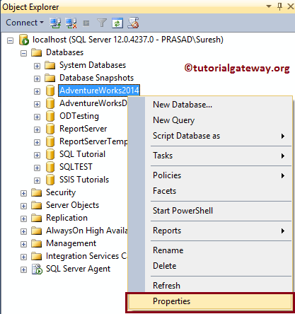 在开始执行备份之前,让我向您展示数据库的实际大小。为此,请右键单击 Server Adventure Works Database 并选择属性。