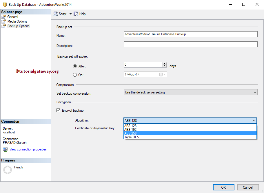 Options(选项):使用此选项卡可以设置过期日期和时间,或使用自定义证书加密 .bak 文件。如果您的数据库大小很大,请选择 Compress backup(压缩备份)选项。