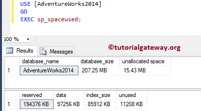 USE [AdventureWorks2014] GO EXEC sp_spaceused;