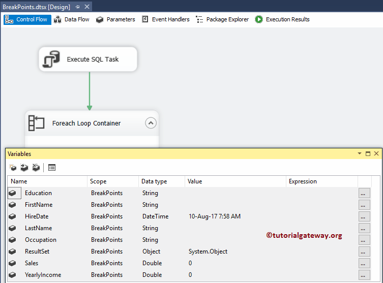 让我们运行 SSIS 断点包。如您所见,变量已更新为第一行。