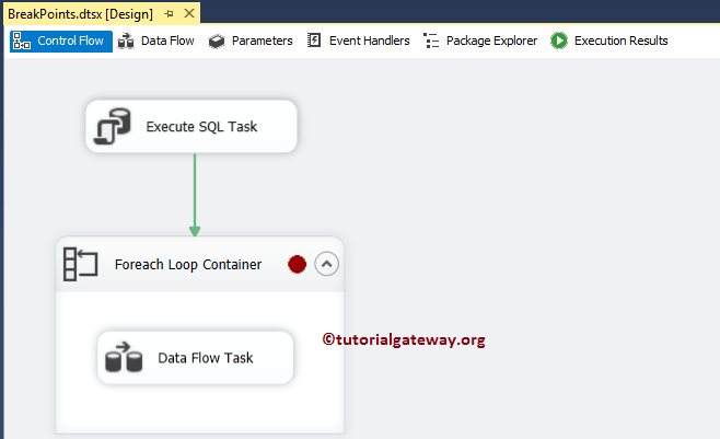 单击“确定”关闭断点配置。从下面的屏幕截图中,您可以看到 Foreach Loop Container 上有一个红色的圆圈。