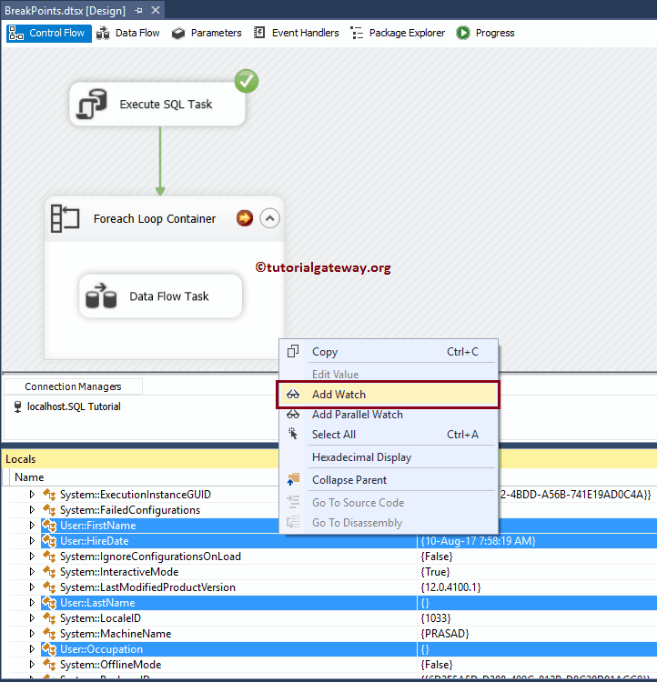 让我们运行 SSIS 断点包,并在局部窗口中检查变量流。