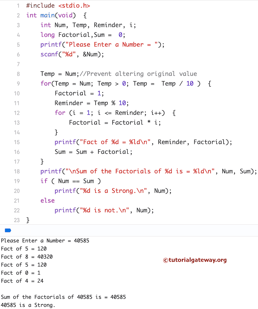 此程序允许用户输入任何正整数。然后,此程序将使用 For 循环检查该数字是否为强数。