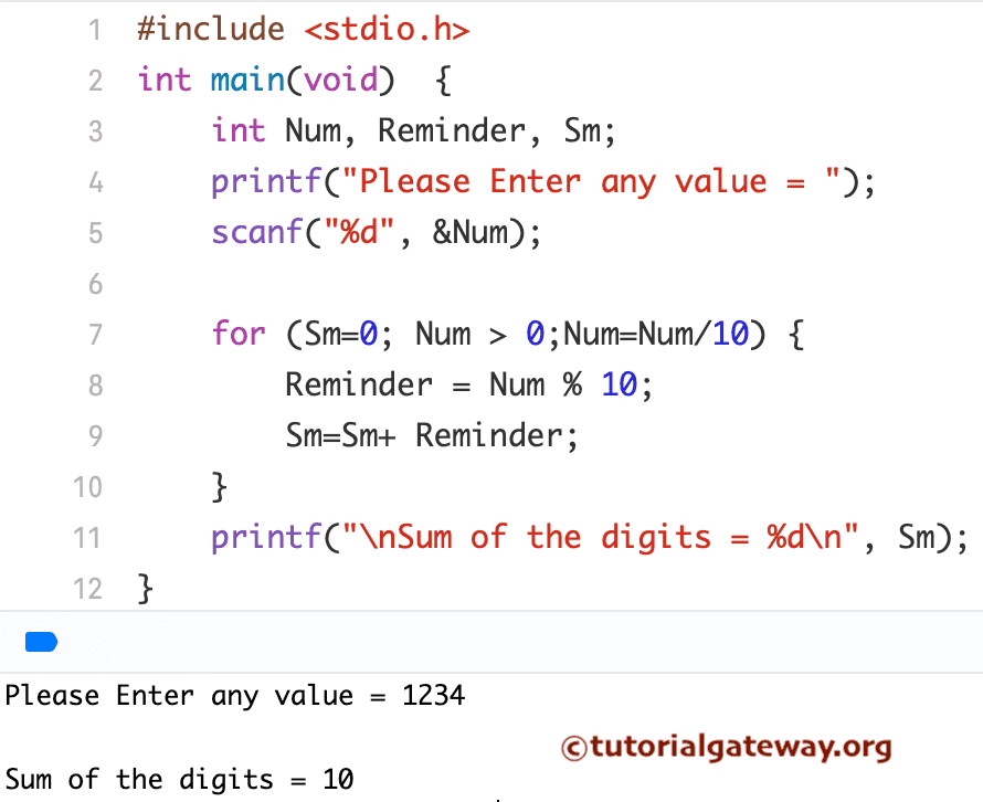此程序允许用户输入任何正整数。接下来,它会将给定的值分解为单独的数字。通过将这些单个数字相加,此程序使用 For 循环计算数字各位之和。