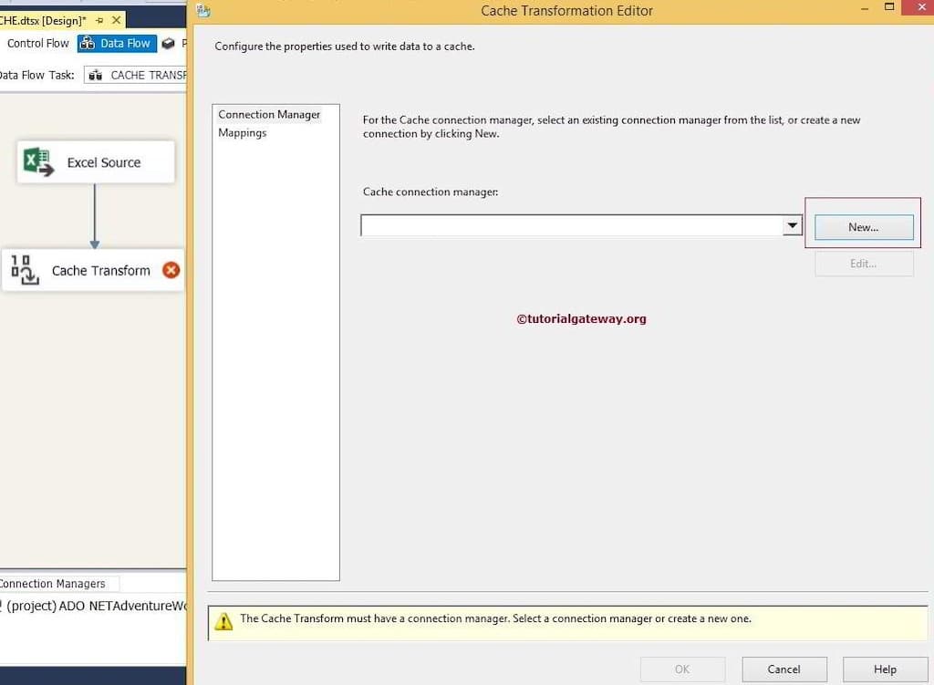 我们在项目中尚未创建 SSIS 缓存连接管理器,请单击“新建”按钮进行配置。