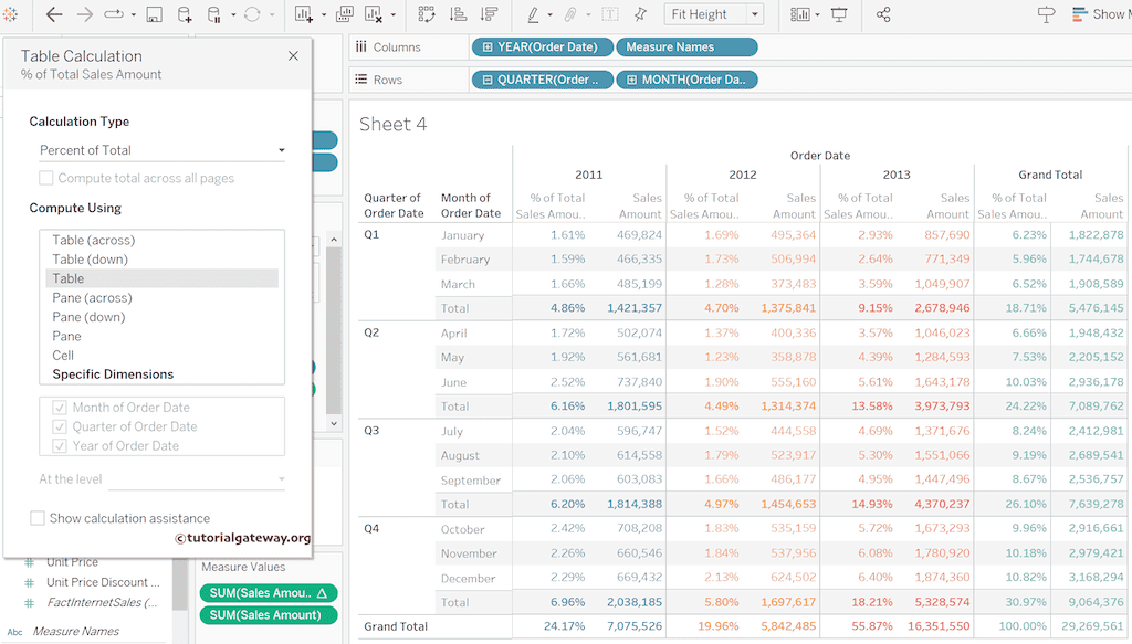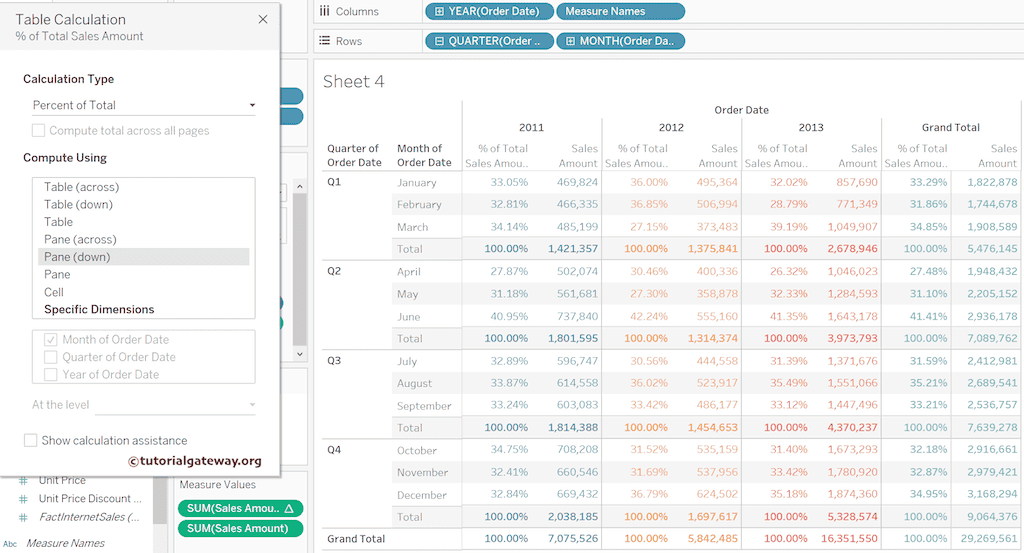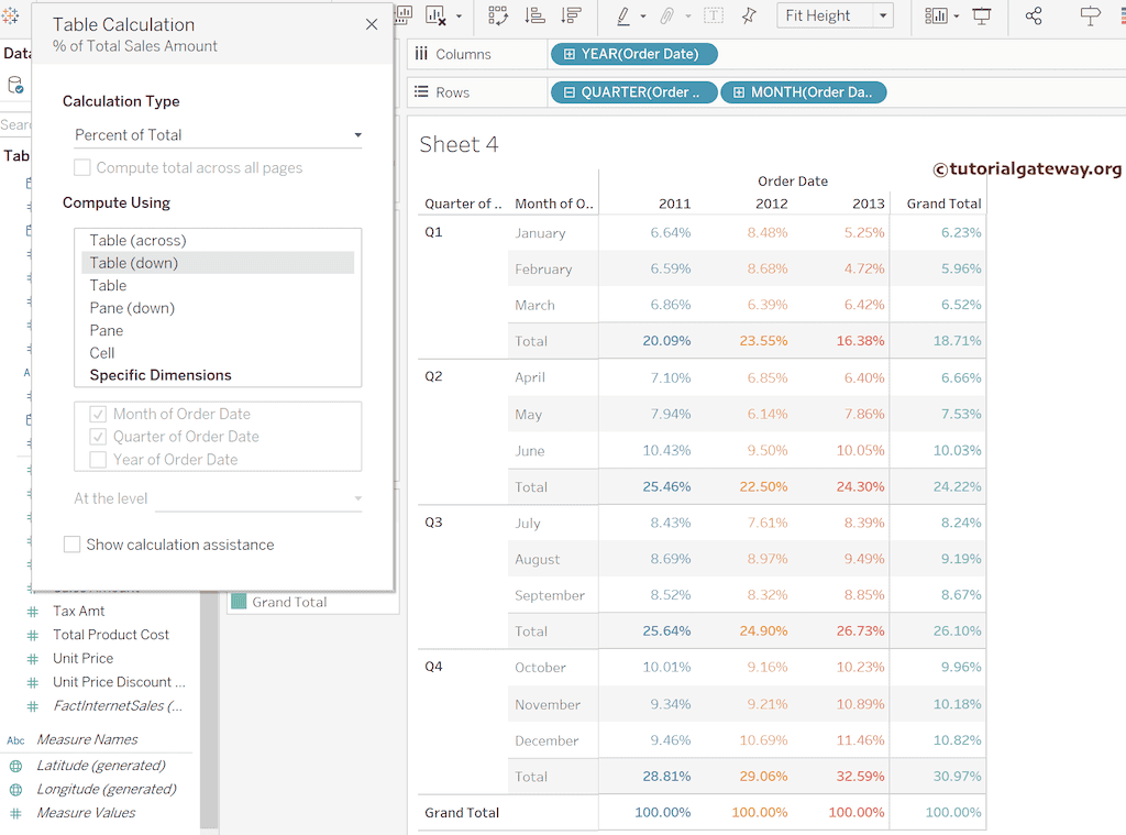 默认情况下,桌面将占总计的百分比计算为“表(跨)”。因此,请将其更改为“表(向下)”选项。