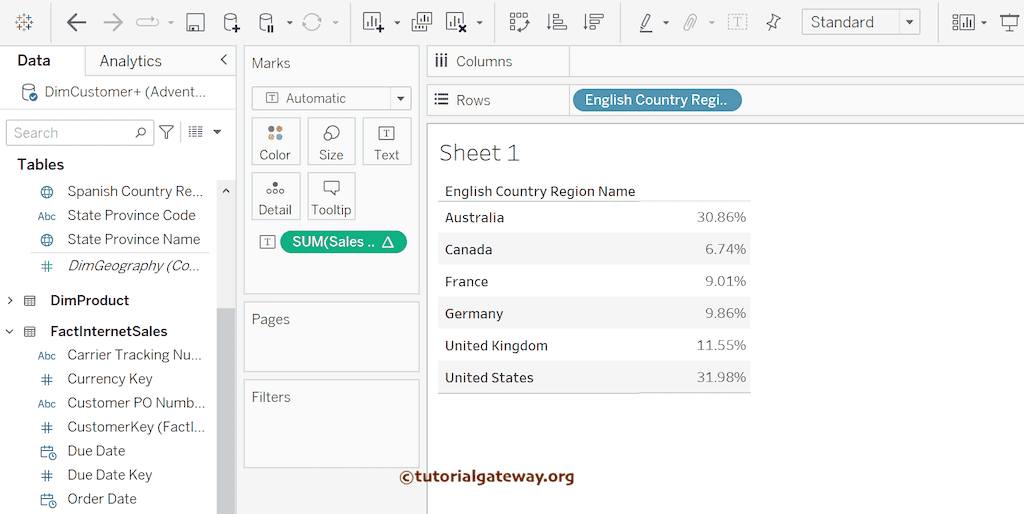 对于此占总计百分比计算演示,我们使用了 AdventureWorksDW 2019 中的 DimCustomer、DimGeography、DimProduct 和 FactInternetSales。