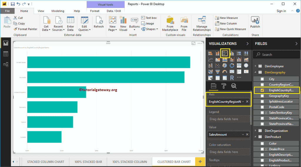 我将“销售额”从“字段”部分拖到“值”字段。接下来,我将“英文国家/地区名称”添加到“轴”部分以创建条形图。此图表显示了按英文国家/地区名称划分的销售额。