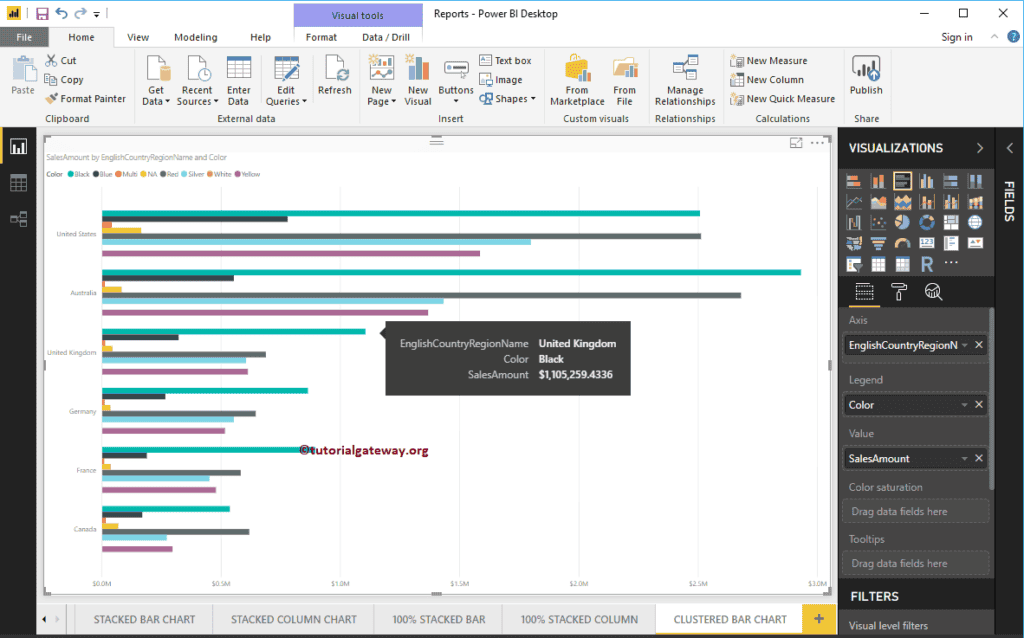 我将“颜色”添加到“图例”部分,以创建簇状条形图,该图显示按国家/地区名称和颜色划分的销售额。将鼠标悬停在任何水平条上,都会显示国家/地区名称、产品颜色和销售额的工具提示。