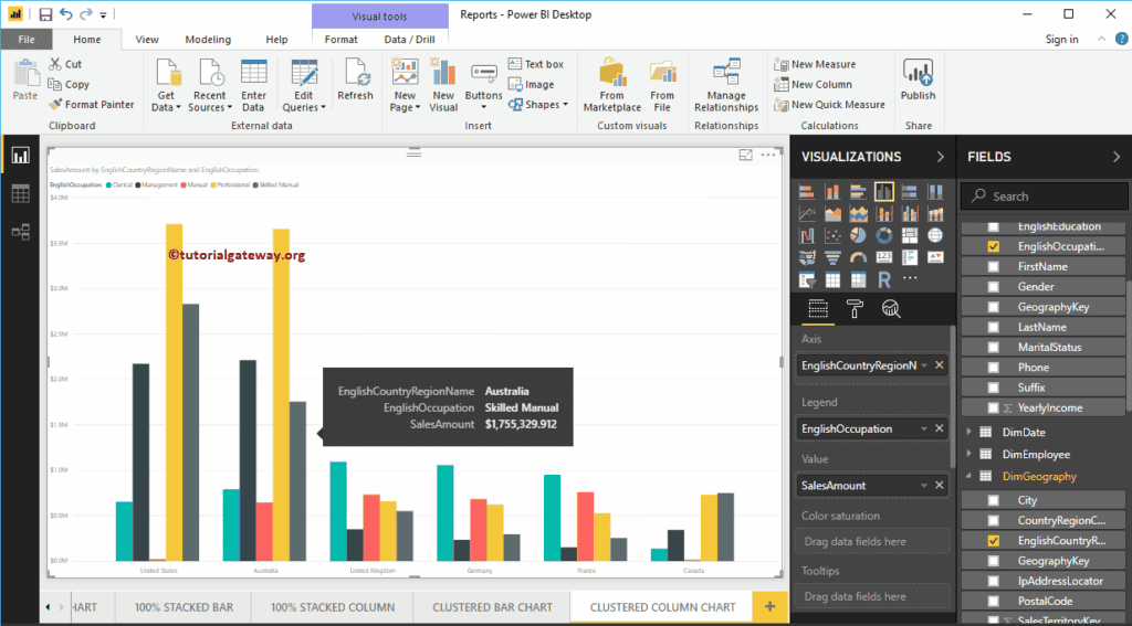 将鼠标悬停在任何垂直条形上都会显示国家/地区名称、客户职业和销售额的工具提示。