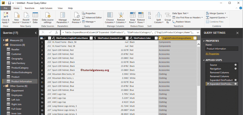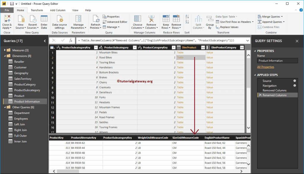单击“编辑查询”选项将打开一个名为 Power Query Editor 的新窗口。从下面的屏幕截图中,您可以看到“产品子类别”表与“产品”和“产品类别”表连接。
