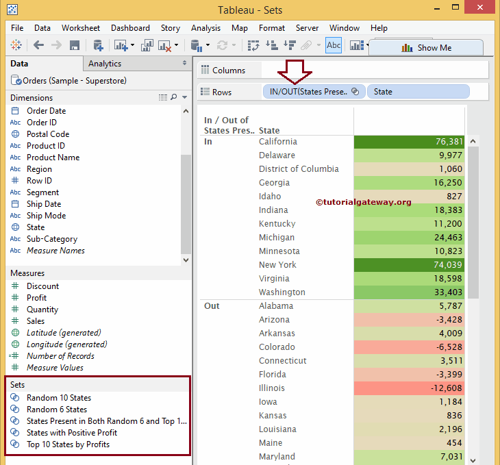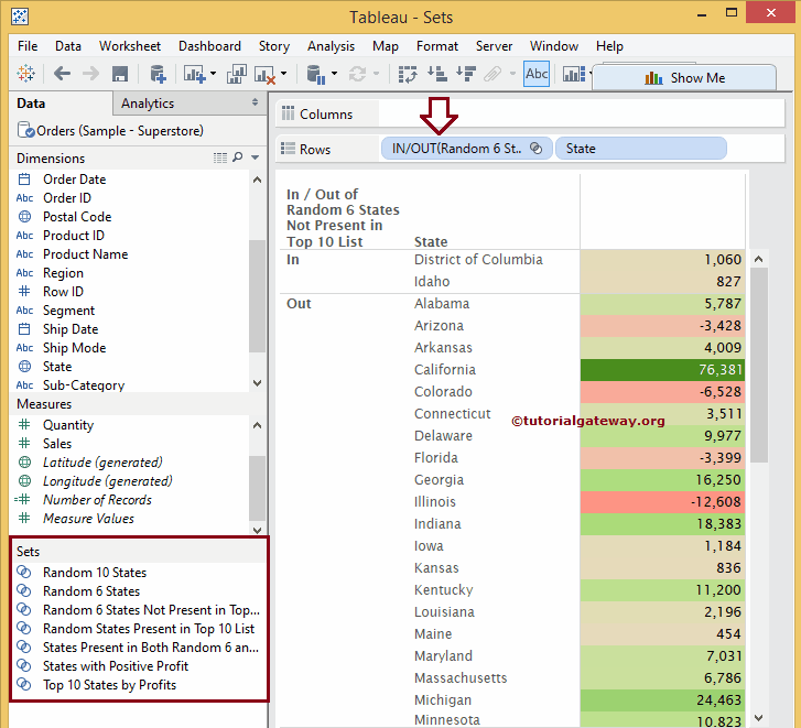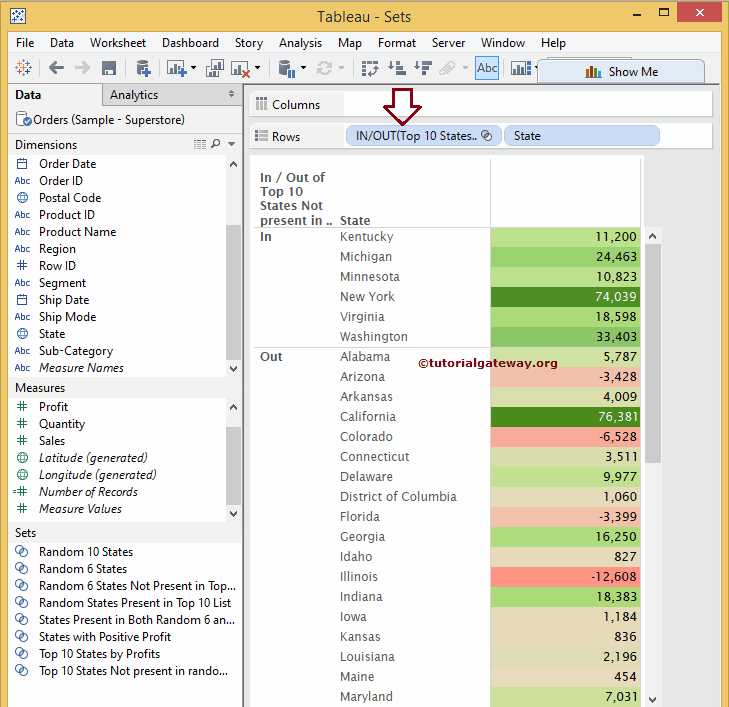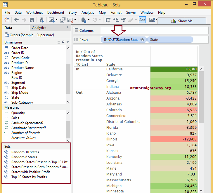 单击“确定”完成创建新组合集。让我们将“两个随机 6 个州和利润排名前 10 的州中存在的州”替换为我们新创建的集。它称为“随机州出现在前 10 名列表中”,然后查看结果。