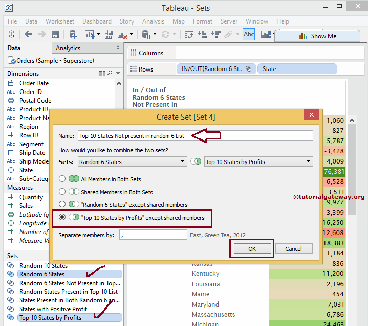 单击“确定”完成创建新组合集。让我们将“随机 6 个州不在前 10 名列表中”替换为我们新创建的集。即“利润排名前 10 的州不在随机 6 个州列表中”,然后查看结果。