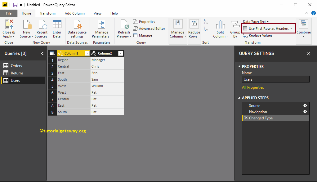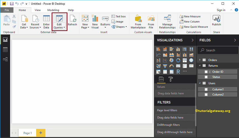 现在,您可以在“字段”部分看到从 Excel 文件导入的所有列。正如您所看到的,“Users”表存在一个问题,因为 Power BI 没有从第一行拾取列名。请单击“编辑查询”选项卡。