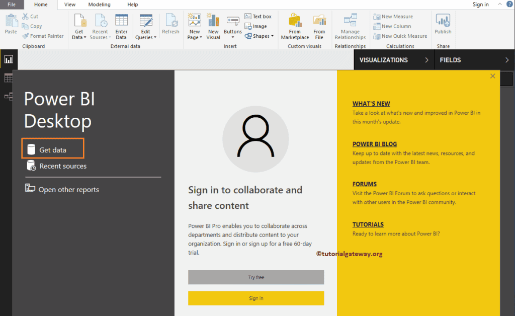 如果您尚未启动桌面版,请双击桌面打开它。打开后,它看起来如下面的屏幕截图。请点击“获取数据”超链接。有关更多数据连接和转换,请>> 点击此处!
