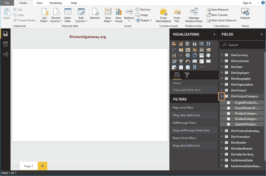 您可以在“字段”部分下看到我们从数据库中选择的表。请展开任何表以查看其中的列(字段)。这是我们在大多数 Power BI 教程中将使用的数据集。