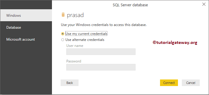在此“将 Power BI 连接到 SQL Server”演示中,我们使用当前的本地 Windows 凭据。如果您没有权限访问服务器,请通过选择“使用其他凭据”来使用其他人的 Windows 凭据。