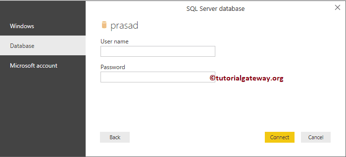 在实际应用中,我们只使用数据库凭据。为此,请选择数据库并输入管理员提供的用户名和密码。目前,我正在使用当前的 Windows 凭据。