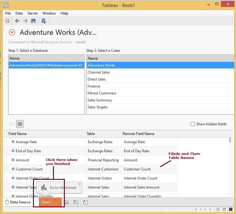 注意:不要担心 Cube、维度等。尝试理解从 Tableau 连接 Microsoft Analysis Services 的过程。但是,如果您很想学习,请阅读我们的 SQL Server Analysis Services 和 Power BI 教程。
