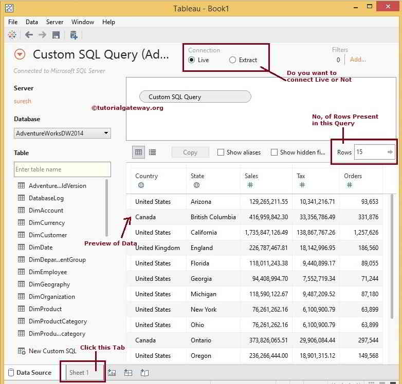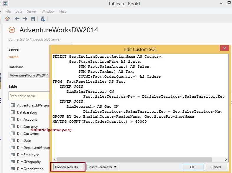 我们在“连接 Tableau 到 SQL Server”示例中使用的自定义查询是: