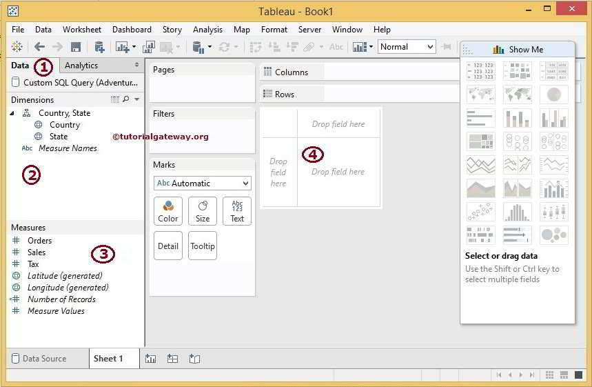 在查看完数据后,单击“工作表 1”来设计报表。现在,您可以在 Tableau 桌面中看到新连接的 SQL Server 连接、查询和表。