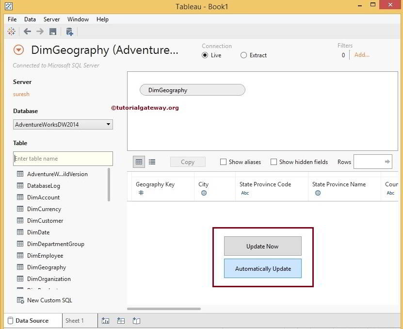 - 服务器:此部分将显示我们在 Tableau 中用于连接 SQL 的实例名称。
