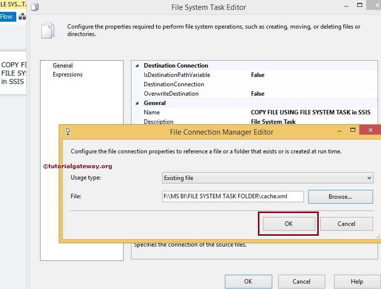 接下来,单击确定以完成 SSIS 包中复制文件使用文件系统任务的配置。让我们运行并查看我们是否成功地使用文件系统任务复制了 Cache.xml 文件。