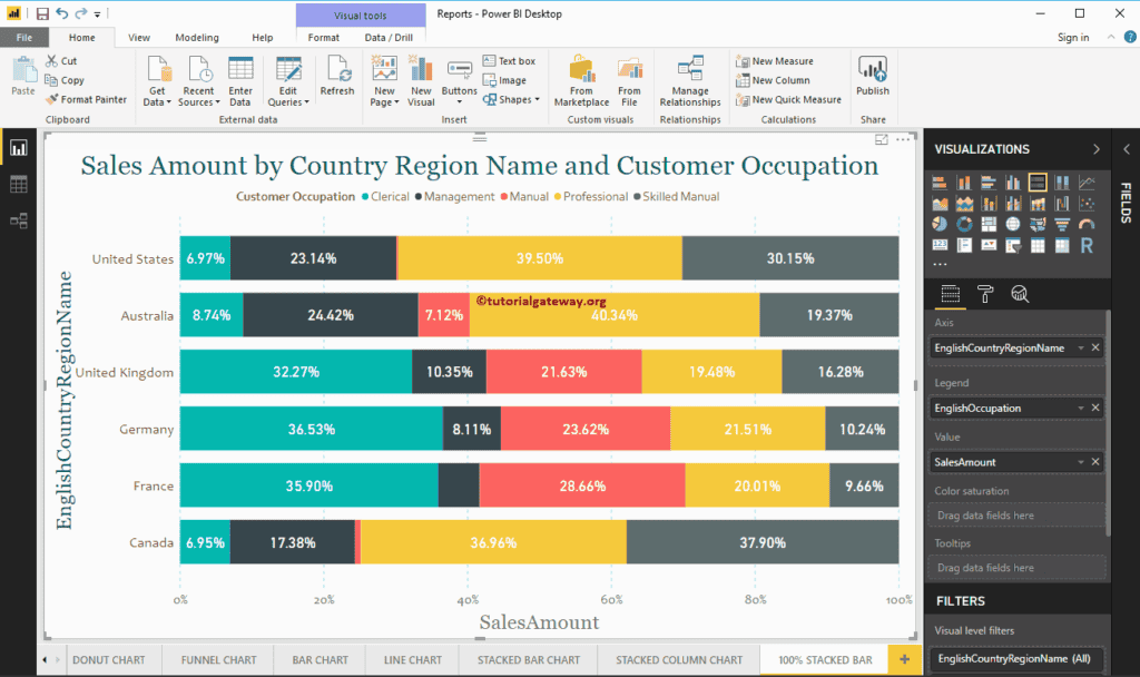 数据标签显示有关水平条(国家/地区)每个组的信息。在这种情况下,它显示每个职业的销售金额(以百分比计)。我将启用数据标签,以便您可以看到每个组的百分比。