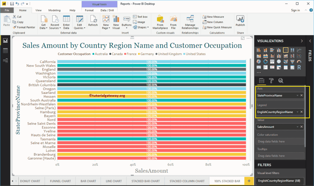 接下来,我们将“职业”添加到“图例”部分,以将其转换为 100% 堆积条形图。将鼠标悬停在任何条形部分上,以显示国家/地区名称、客户职业和销售金额的工具提示。