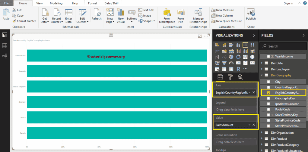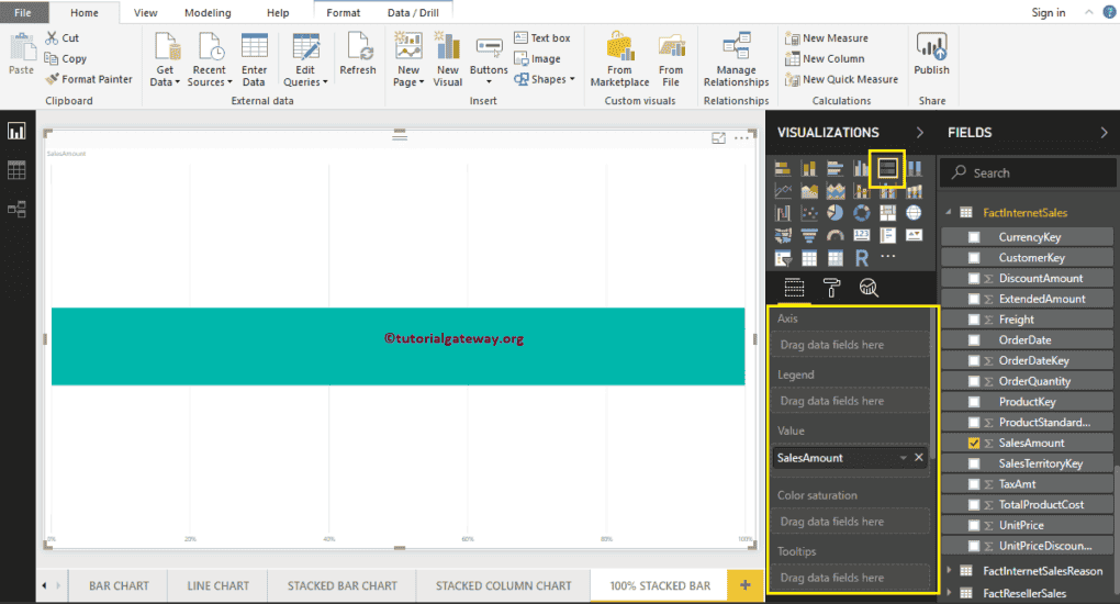 要创建 Power BI 100% 堆积条形图,请将“销售金额”从“字段”部分拖放到“画布”区域。它会自动创建一个柱形图。通过在“可视化”部分中单击图表,可以自动将柱形图转换为 100% 堆积条形图,如下所示。