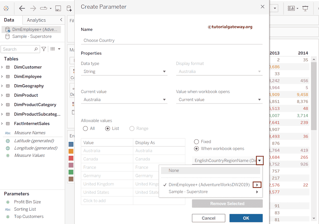 这将打开如下所示的窗口。请将“数据类型”更改为“字符串”,并将“允许值”设置为“列表”。我们没有手动键入项目,而是从 Adventure Works DW 2019 中选择了“英语国家/地区名称”字段。要获取相同的字段,请点击“添加值来自”按钮旁边的向下箭头,选择“数据源”,然后选择“字段名称”。