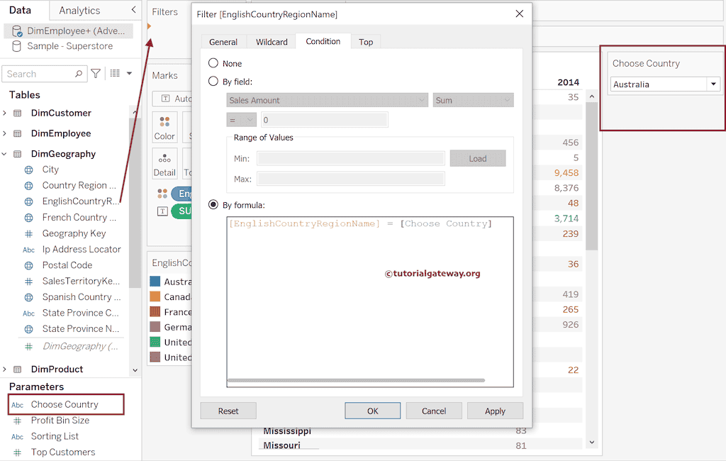 首先,单击新创建的 参数旁边的向下箭头,然后选择“显示参数”选项。接下来,将“英语国家/地区名称”拖放到“筛选器”架上,这将打开以下窗口。要在“表格报告”中使用此字符串参数,请转到“条件”选项卡并编写以下表达式。