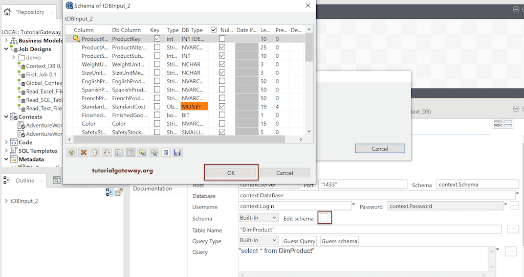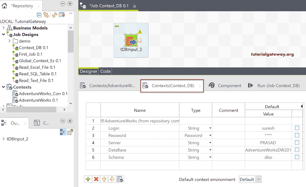 此 Talend 页面允许您添加上下文变量、类型和值。我们已根据以下屏幕截图添加了登录名、密码、服务器(SQL Server 实例名称)、数据库和数据库架构。这些变量有助于连接到 SQL Server Prasad 实例中的 AdventureWorks 2014 数据库。