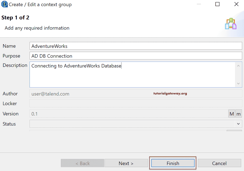 单击 Talend 的“创建上下文组”选项将打开以下窗口。请填写名称、此上下文组的目的以及上下文组变量的简要说明。