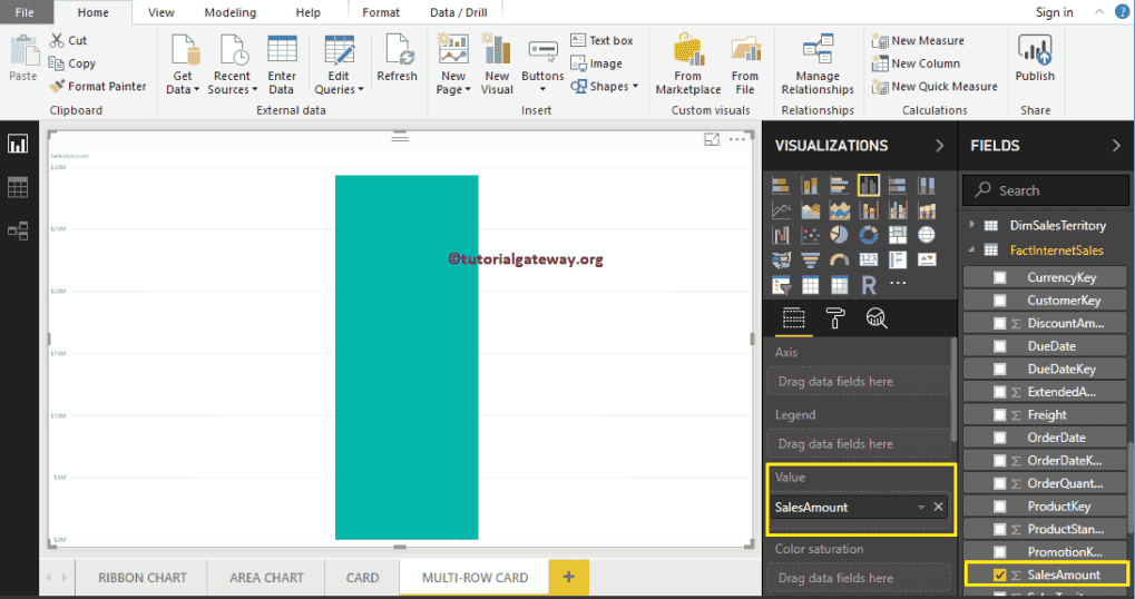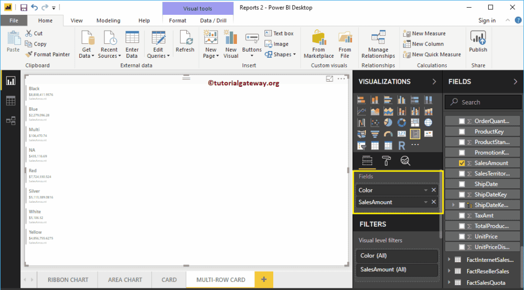 我将“Product Color”(产品颜色)和“Sales Amount”(销售额)拖到“Fields”(字段)部分。正如您所见,它显示了产品颜色和销售额的多行卡片。