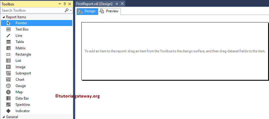 这将打开“添加新项”窗口,其中包含所有可用选项。请选择选项并根据您的要求重命名它。我将新创建的报表名称更改为一个更有意义的名称(FirstReport.rdl)