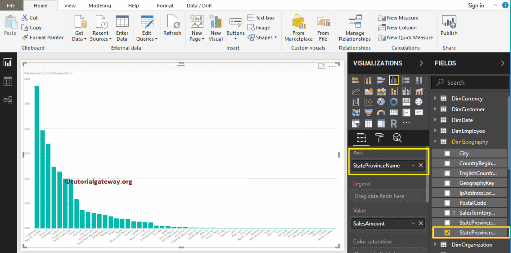 我将“销售额”从“字段”部分拖到“值”字段,并将“省/州名称”拖到“轴”部分。接下来,按“省/州名称”对数据进行排序(默认按“销售额”排序)。为此,请单击右上角的 ...(三个点),然后选择“按省/州名称排序”选项。