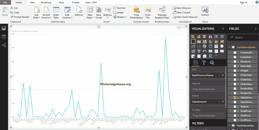 通过单击“可视化”部分下方的所示图标,桌面会自动将柱形图转换为折线图。从下面的屏幕截图中,您可以看到显示省/州名称销售趋势的折线图。