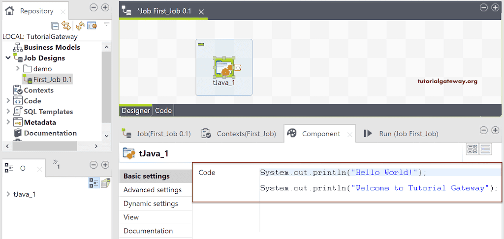 Component选项卡是我们主要用于进行任何转换或字段操作的选项卡。在这里,我们使用简单的print line语句打印两条消息。请参考Java Tutorial页面来理解Java。我们在下面图片中使用的代码是